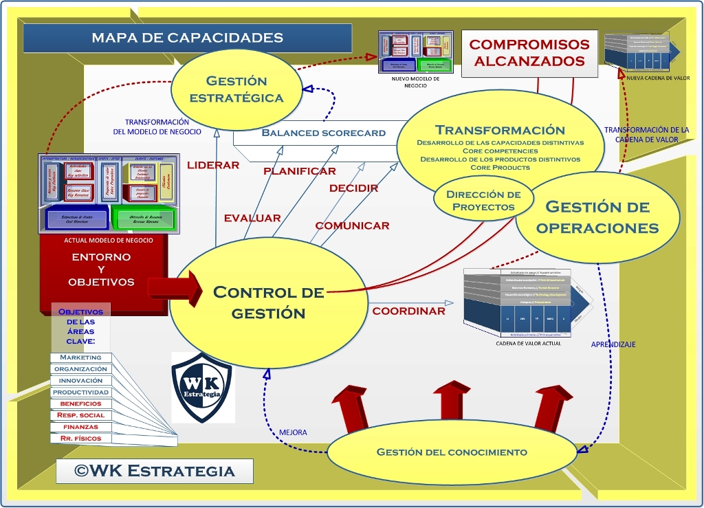 En WK Estrategia miramos al conjunto buscando la integración del empleo más adecuado de las capacidades (lo que incluye la estructura necesaria) con los efectos que se esperan conseguir con ello. Pretendemos lograr que a pesar del cambio constante, su rapidez, frecuencia e intensidad, una organización pueda adaptarse con flexibilidad "sin perder el norte" del negocio y sus metas corporativas.