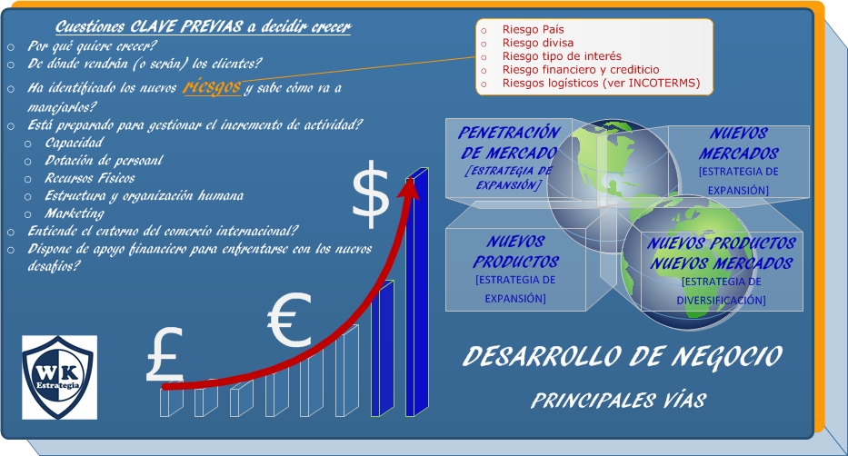 En el siguiente gráfico puede ver las seis cuestiones clave que debería hacerse antes de tomar la decision de crecer. La primera de ellas es "Por qué" tiene que crecer?. Su organización quiere crecer o necesita crecer para conseguir economías de escala o de alcance, vencer a la competencia, servir otros mercados, o que sólo quiere ver mundo...?