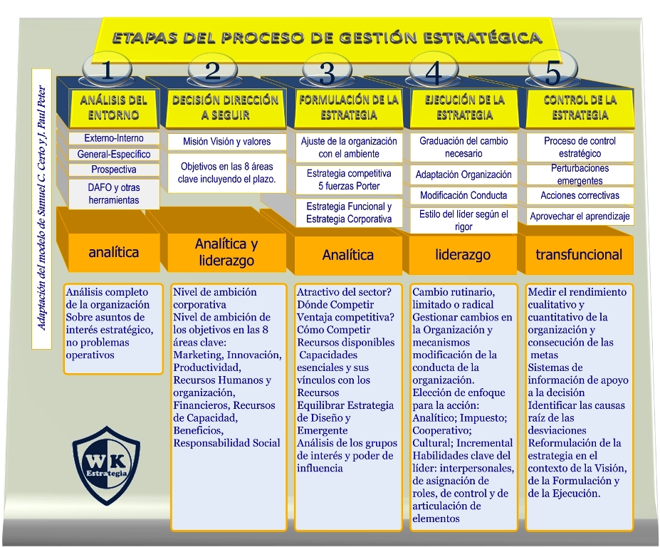 - La Gestión del proceso estratégico pretende conseguir el desarrollo y ejecución de la estrategia con el objetivo de alcanzar una eficaz formulación e implantación de los planes estratégicos. Esto requiere una cuidadosa planificación y control de las decisiones estratégicas y sus acciones correspondientes para conseguir las metas del negocio. También se requiere un un firme compromiso en este sentido junto con la habilidad de comunicar con eficacia e inspirar a sus empleados a buscar y enfrentarse con los desafíos que surjan, ya sean amaenazas u oportunidades.